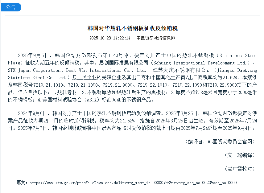 2025年10月28日,據(jù)中國(guó)貿(mào)易救濟(jì)信息網(wǎng)一則公告《韓國(guó)對(duì)華熱軋不銹鋼板征收反傾銷稅》顯示,“2025年9月5日,韓國(guó)企劃財(cái)政部發(fā)布第1140號(hào)令,決定對(duì)原產(chǎn)于中國(guó)的熱軋不銹鋼板(Stainless Steel Plate)征收為期五年的反傾銷稅,其中,思創(chuàng)國(guó)際發(fā)展有限公司(Schuang International Development Ltd.)、STX Japan Corporation、Best Win International Co., Ltd.、江蘇大庚不銹鋼有限公司(Jiangsu Daekyung Stainless Steel Co. Ltd.)及上述企業(yè)的關(guān)聯(lián)企業(yè)及其出口商和中國(guó)其他生產(chǎn)商/出口商稅率均為21.62%。本案涉及韓國(guó)稅號(hào)7219.21.1010、7219.21.1090、7219.21.9000、7219.22.1010、7219.22.1090和7219.22.9000項(xiàng)下的產(chǎn)品,但不包括以下:1.熱軋卷材;2.不銹鋼厚板坯經(jīng)熱軋后生產(chǎn)的黑板材;3.厚度不超過8毫米且寬度小于2000毫米的不銹鋼板;4.美國(guó)材料試驗(yàn)協(xié)會(huì)(ASTM)標(biāo)準(zhǔn)904L的不銹鋼產(chǎn)品。”